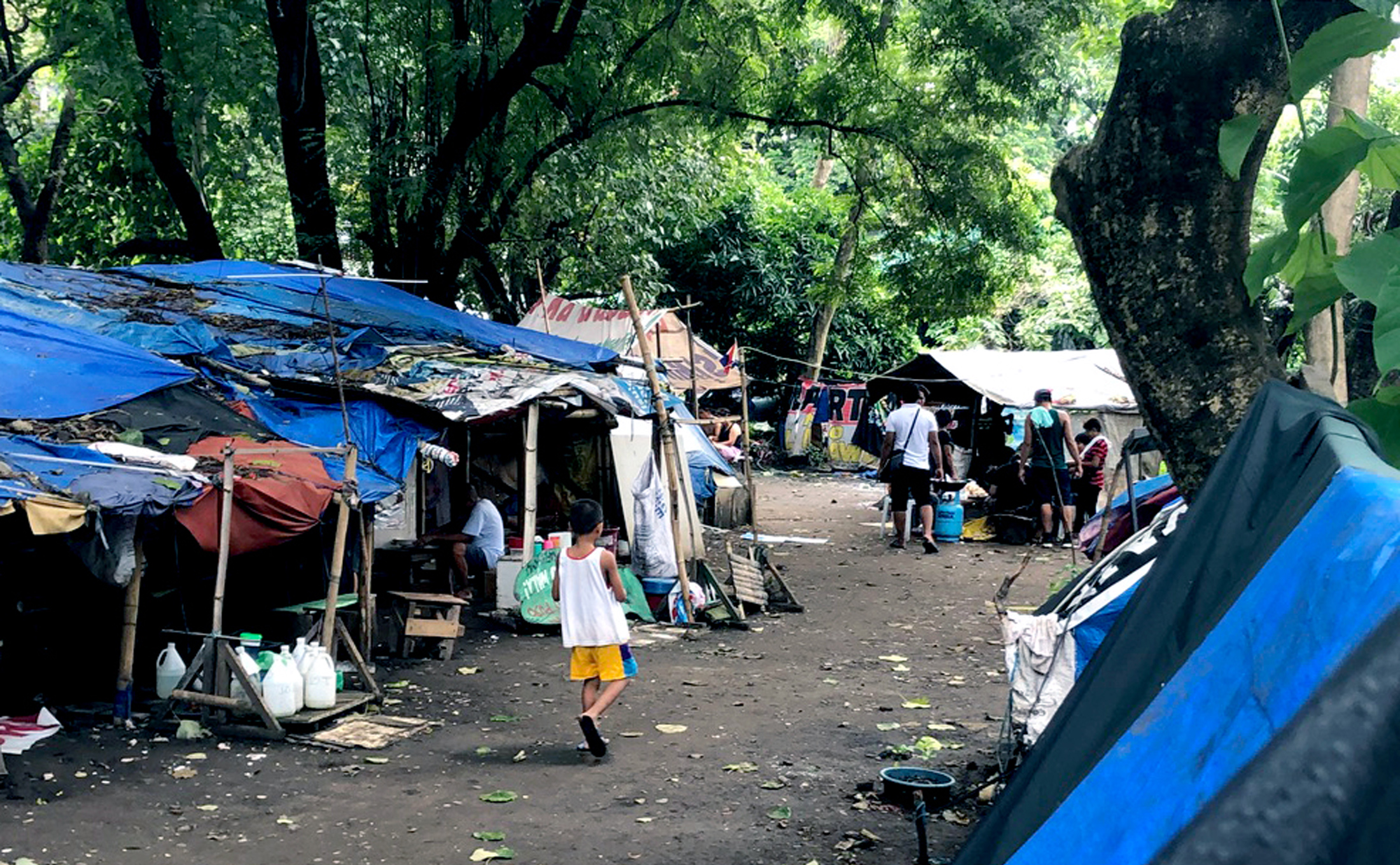 キャンパスにはお手製の家がずらりと並ぶ。大木の幹を利用してロープを張り、そこに竹や角材で骨を組み、ビニールシートをかける。長屋のようだ。調理場や水浴び場、菓子などが買える小さな店まである。同じ大学の構内の建物に構えるフィリピン人権委員会のトイレを借りて、用をたす。